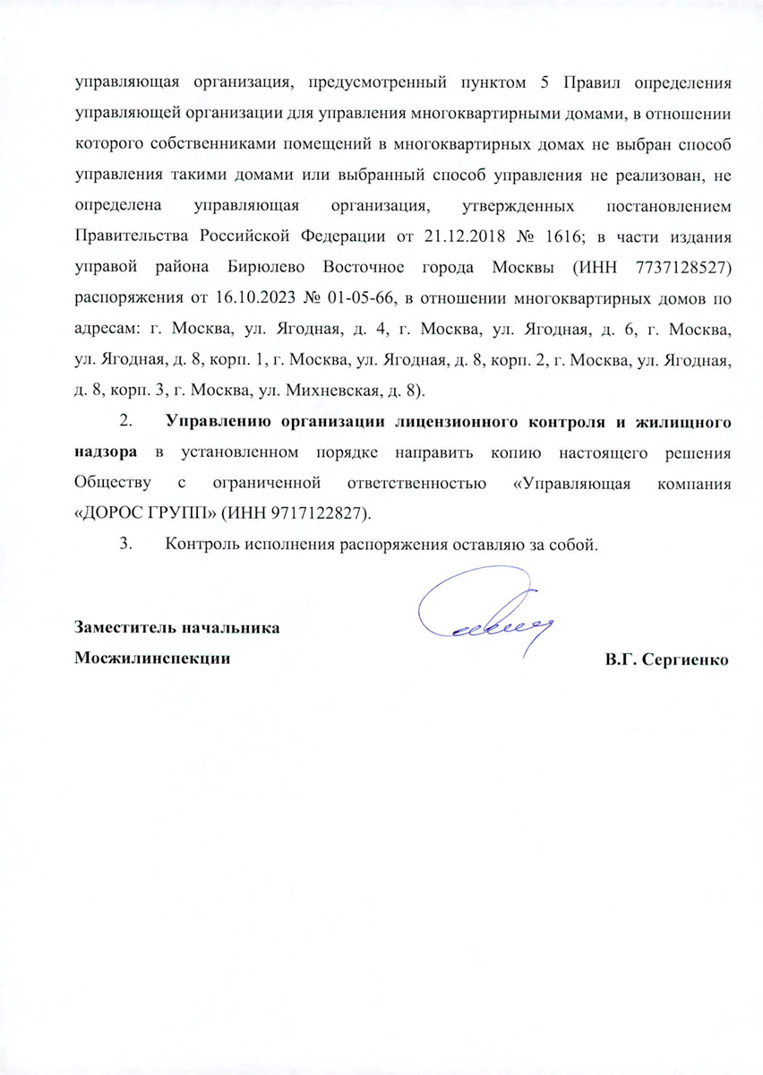 Ранее было опубликовано распоряжение МОСЖИЛИНСПЕКЦИИ о приостановке рассмотрения заявления ООО "УК ДОРОС ГРУПП" на управление домами:
