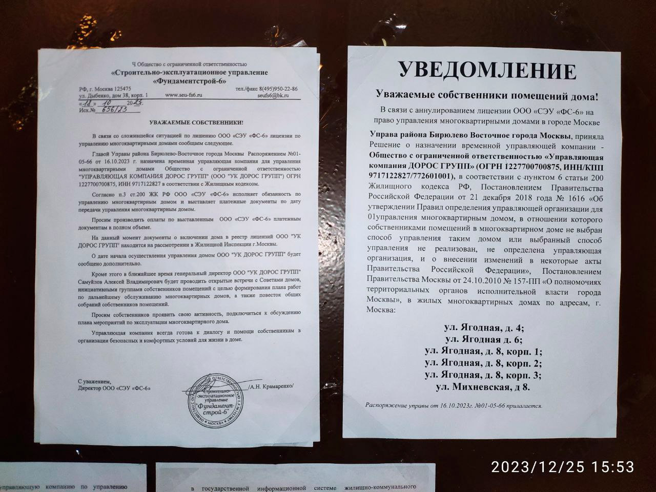 Накануне пришла платежка от СЭУ за декабрь. На подъездах появились объявления о назначении Дорос Групп временной управляющей компанией.