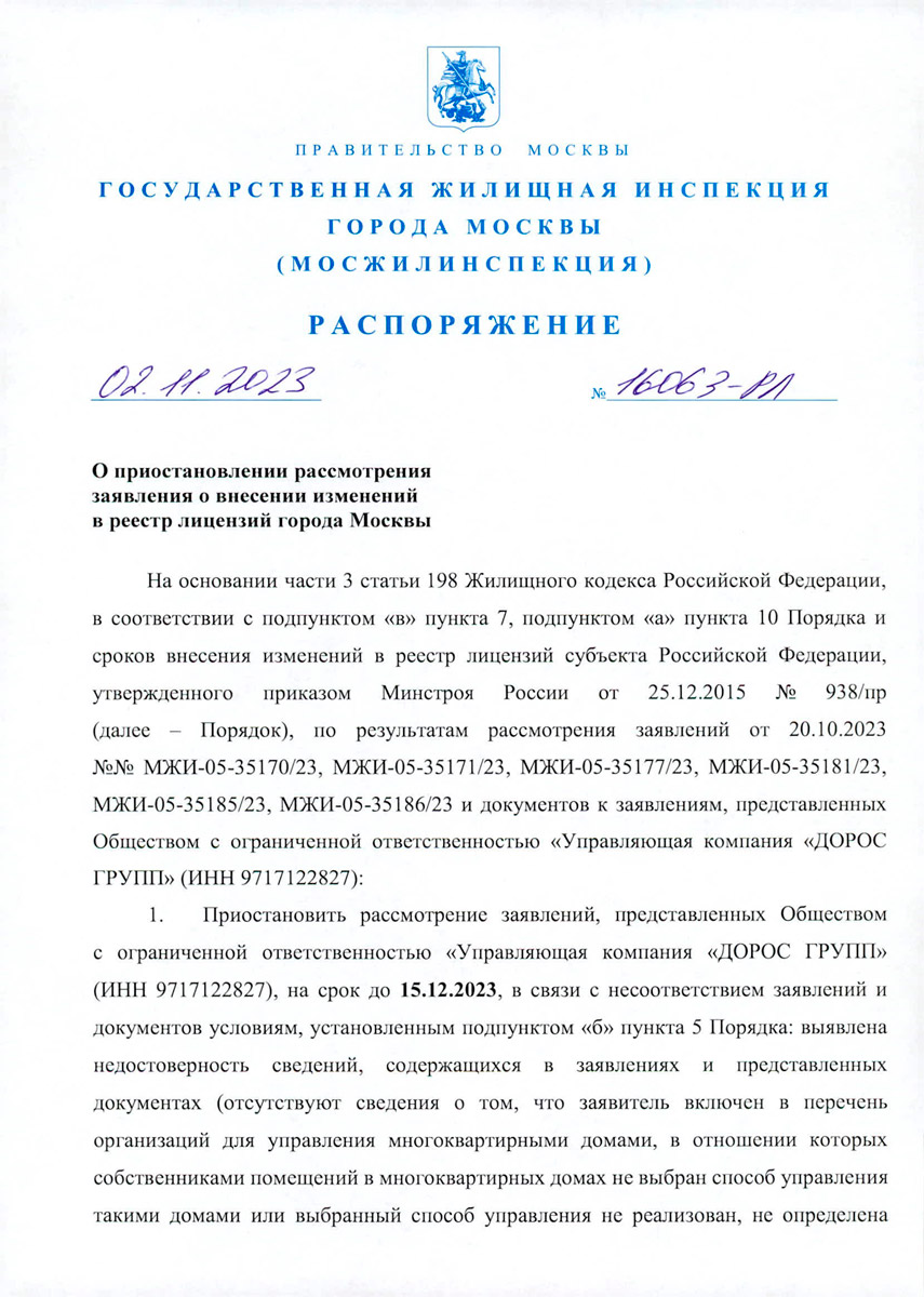 И второй момент: 02 ноября 2023 года МОСЖИЛИНСПЕКЦИЯ приостановила рассмотрение заявления ООО "УК ДОРОС ГРУПП" на управление нашими домами.