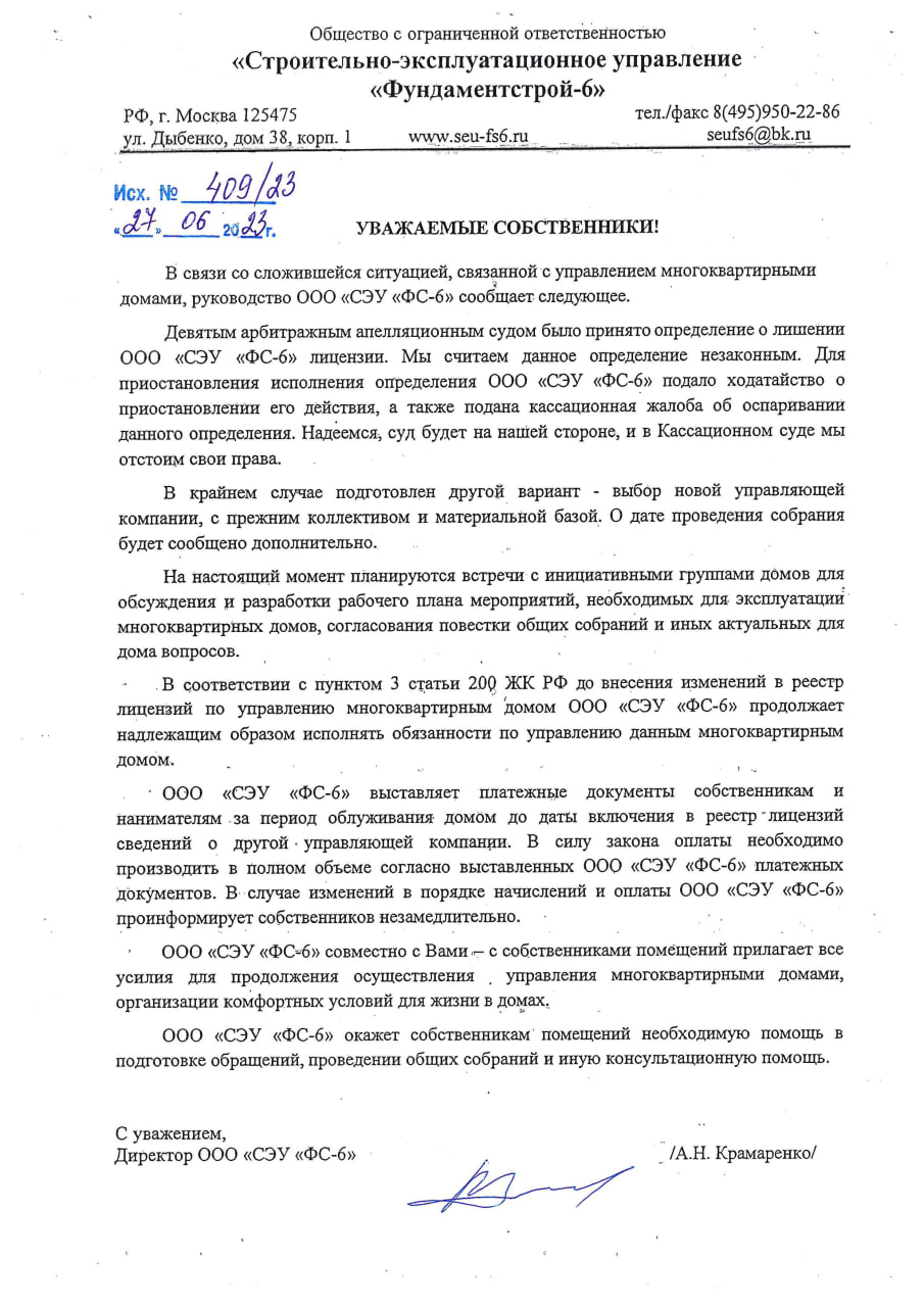 Генеральный директор ООО "СЭУ"ФС-6" сообщил, что подано ходатайство на приостановку постановления суда по отзыву лицензии на время рассмотрения кассационной жалобы (на период рассмотрения кассационной жалобы ООО СЭУ "ФС-6" продолжает обслуживать дома 2-3 месяца). Если ходатайство не будет одобрено то УК СЭУ "ФС-6 организует ОСС с выбором новой УК с текущим штатом и материальной базой (простым языком - смена Юр.лица).