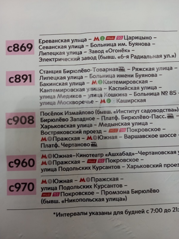 cadet писал(а):Теперь это 826 . Пассажирка - Бирюлёвская - Лебедянская - Липецкая - МКАД - М.Домодедовская - Домодедовская ул. - М.Орехово