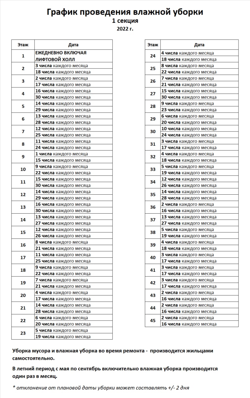 Re: График влажной уборки на этажах