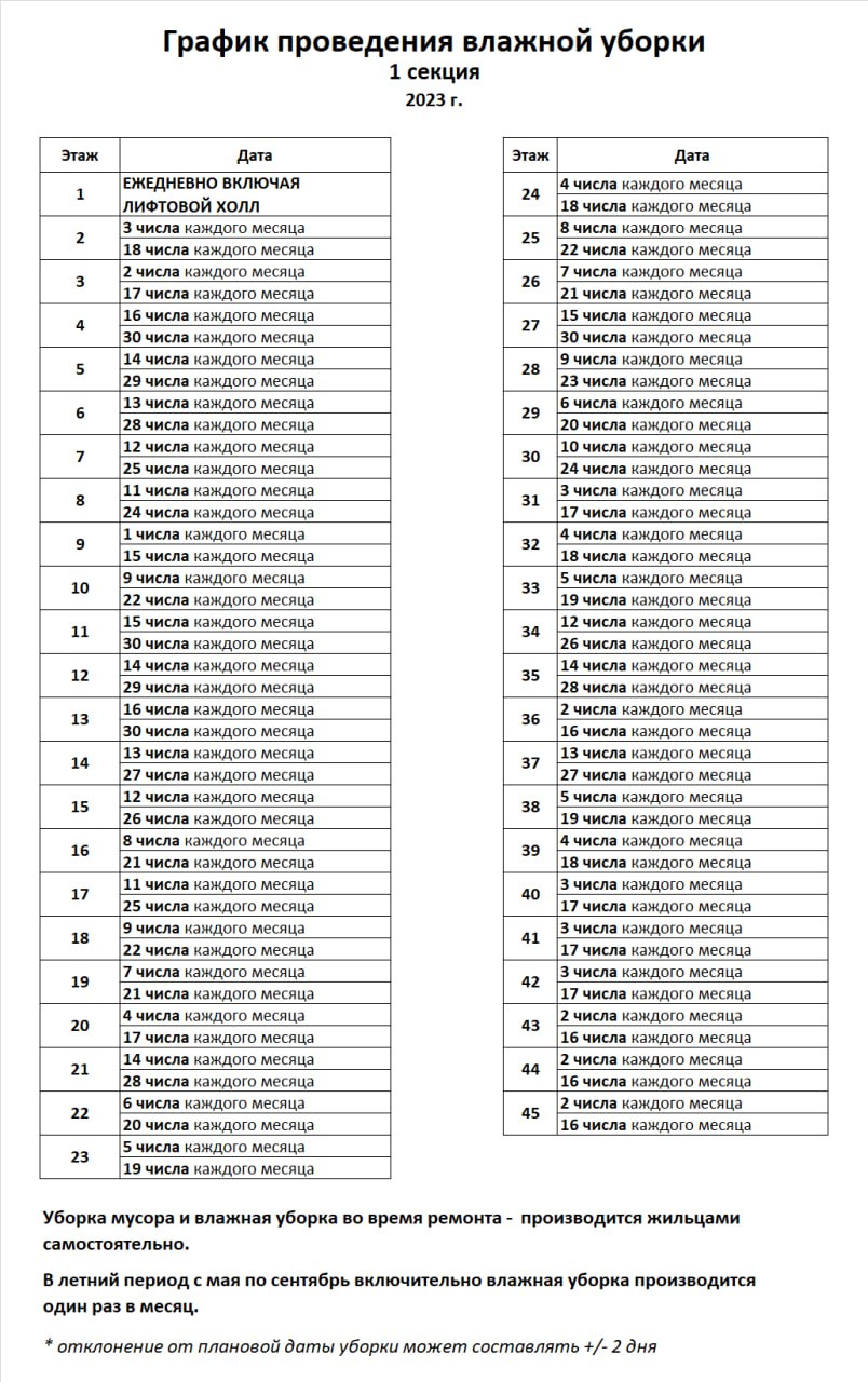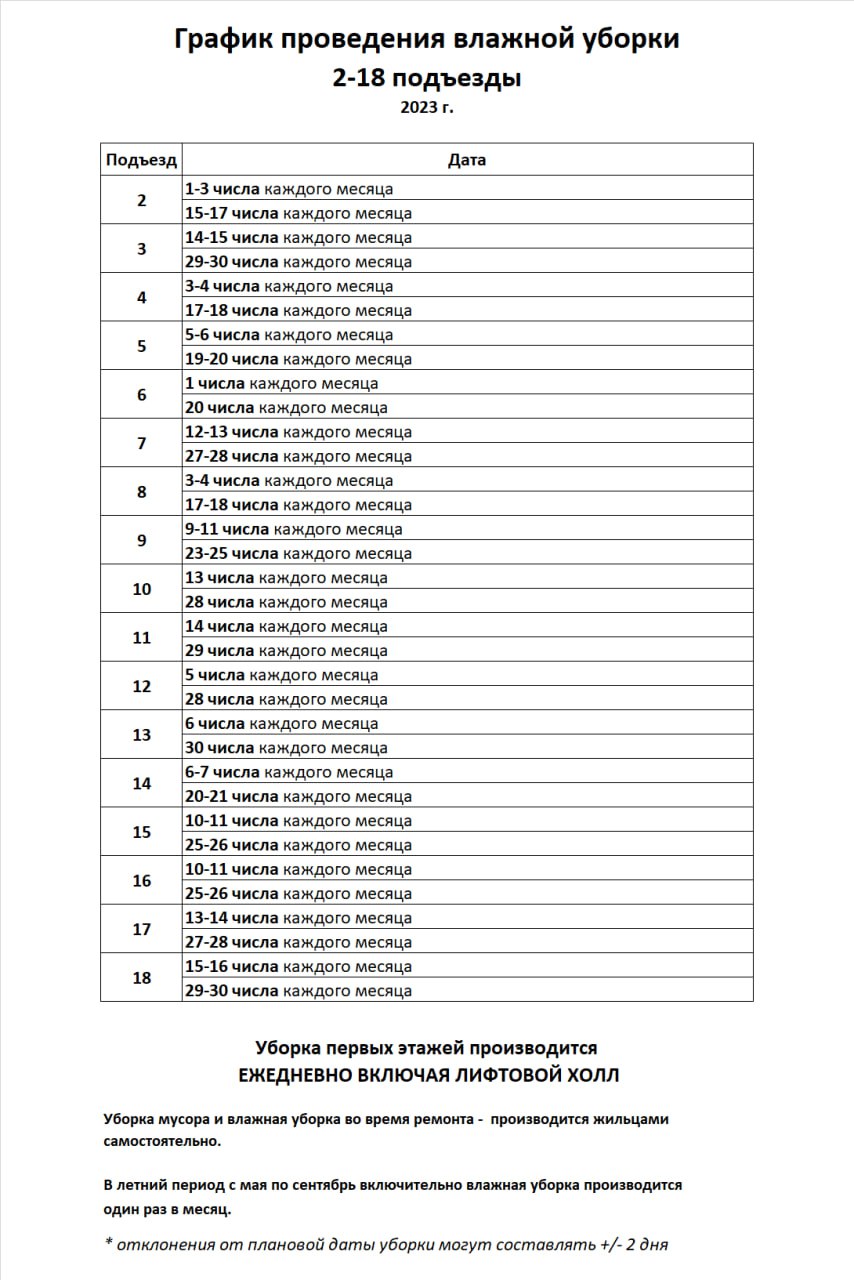 Уважаемые соседи, напоминаю, что с 1 мая по 30 сентября влажная уборка этажей производится один раз в месяц.