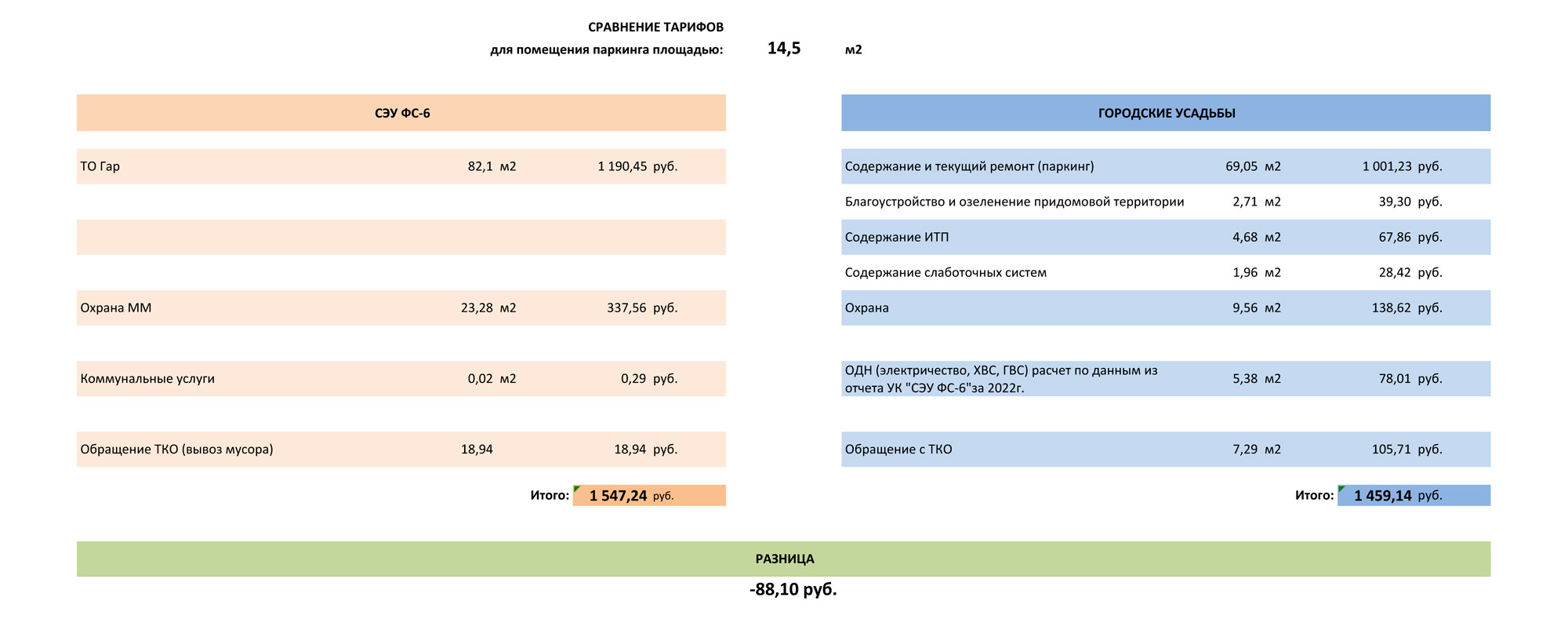 Вот информация по сравнению тарифов СЭУ и Городских Усадеб по паркингу