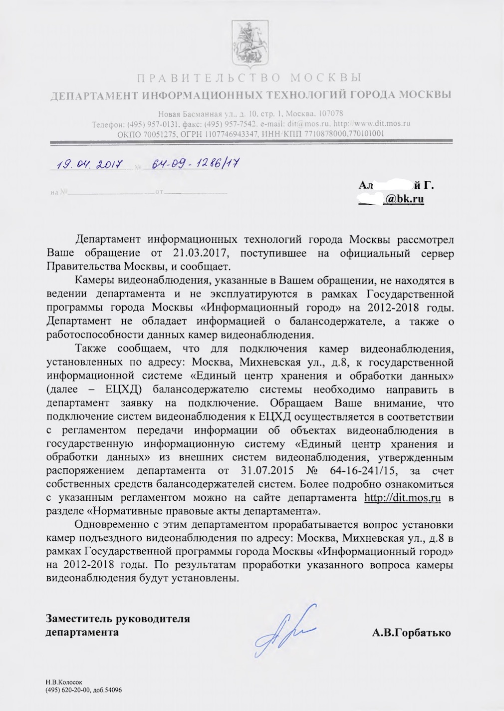 KNP писал(а):Пришел ответ, смысл таков, по Михневской д.8 запланирован монтаж камер подъездного видеонаблюдения по окончании работ МГТС.