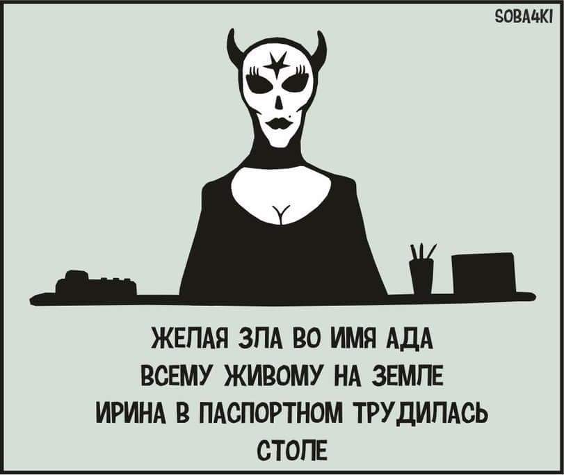 :lol: "Чтобы бесить ее своей улыбкой" - это точно!!! И лучше женщине приходить(если семья) - тогда вообще можно взбесить ее одним только видом! Первый раз довела меня до слез - вообще принимать не хотела, хотя все было собрано, кроме конвертиков... Мымрее паспортистки не нашлось, видимо, посадили ангела..во гневе!!! :lol: