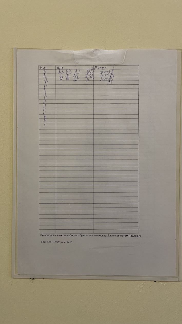 На каждом этаже графики уборки с указанием времени проведения работ и подписью исполнителя