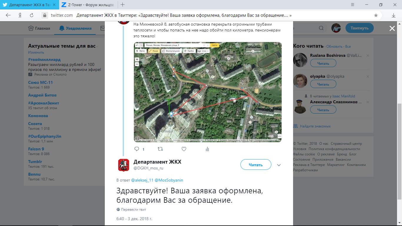 AlekseyE писал(а):Начал я тут обращаться к Сергею Семеновичу через твитер. На каждый его пост о благоустройстве города отвечал про нашу трубу и кажется заметили, мало надежд конечно, но все же.