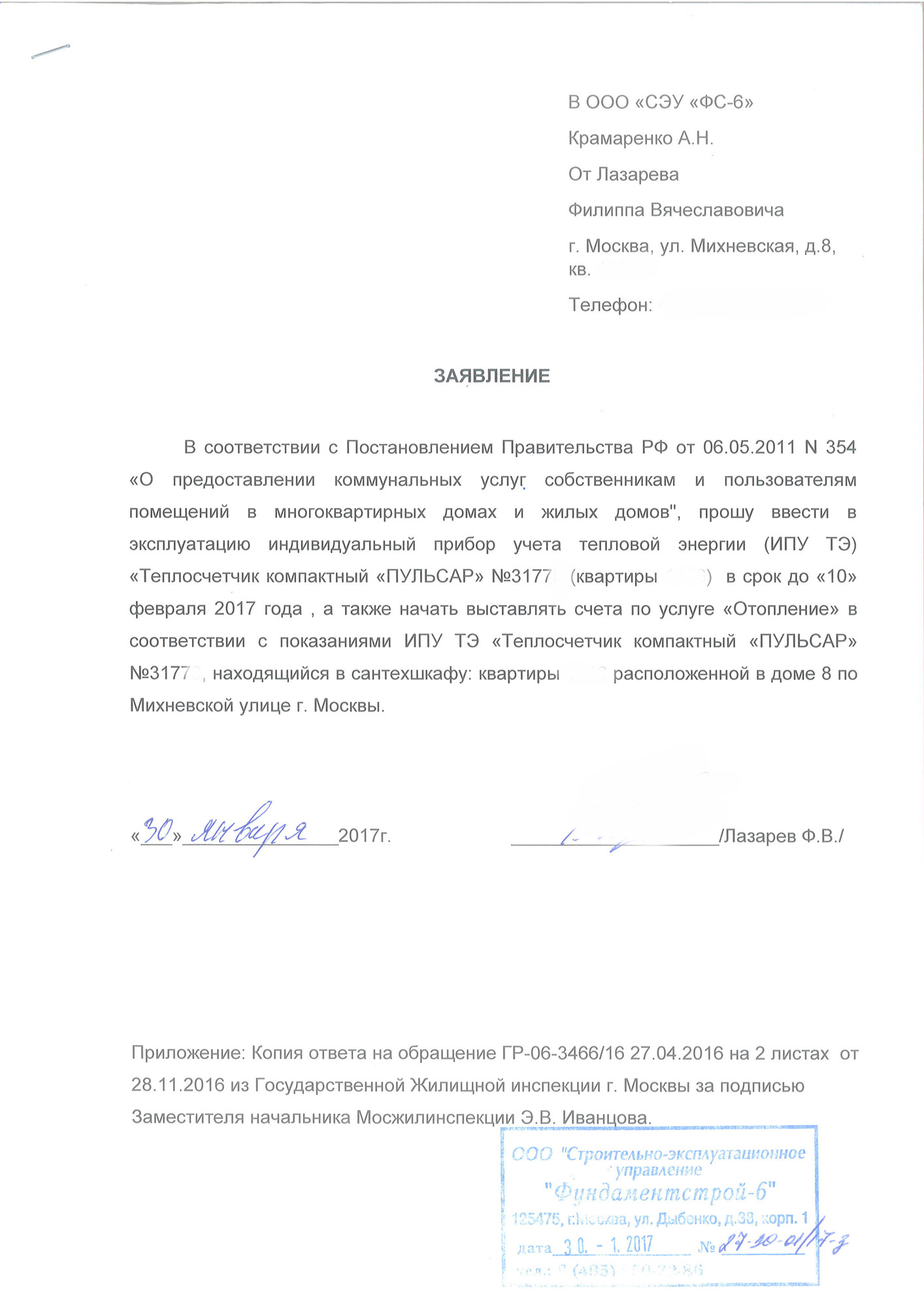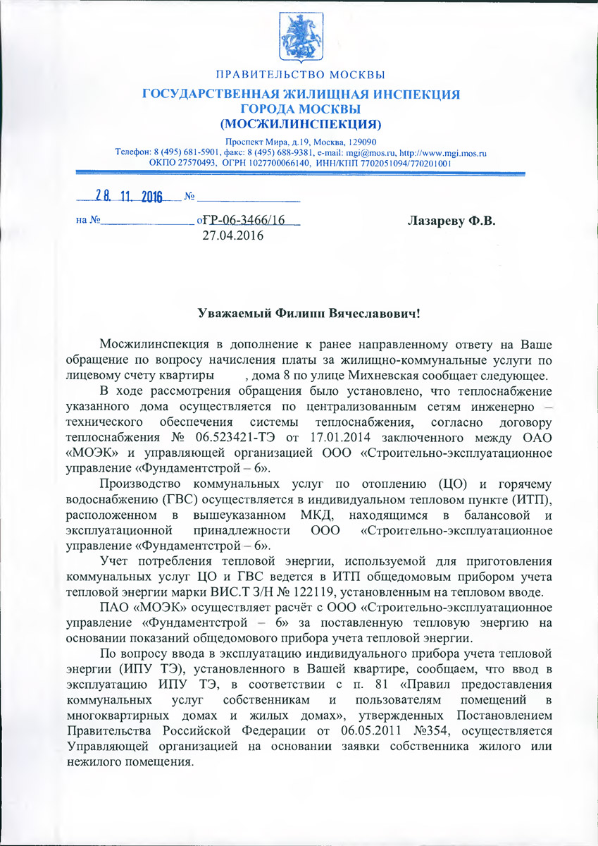 В соответствии с письмом из МОСЖИЛИНСПЕКЦИИ я написал заявление на ввод в эксплуатацию ИПУ ТЭ (в соответствии c Постановлением Правительства РФ от 06.05.2011 N 354 – срок ввода в эксплуатацию ИПУ ТЭ должен быть произведен не позднее 15 рабочих дней с момента заявки – посмотрим как будет на практике, в случае успешного опыта выложу образец заявления)