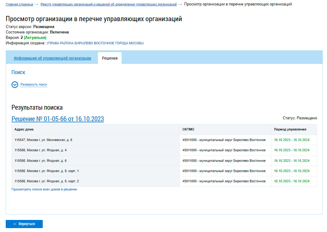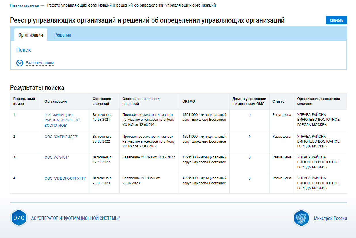 Реестр временных УК по району Бирюлево Восточное