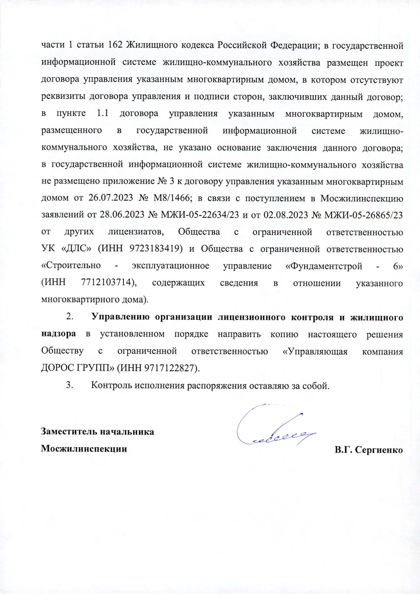 Отказ от 26.09.2023 Мосжилинспекции ДОРОС ГРУПП