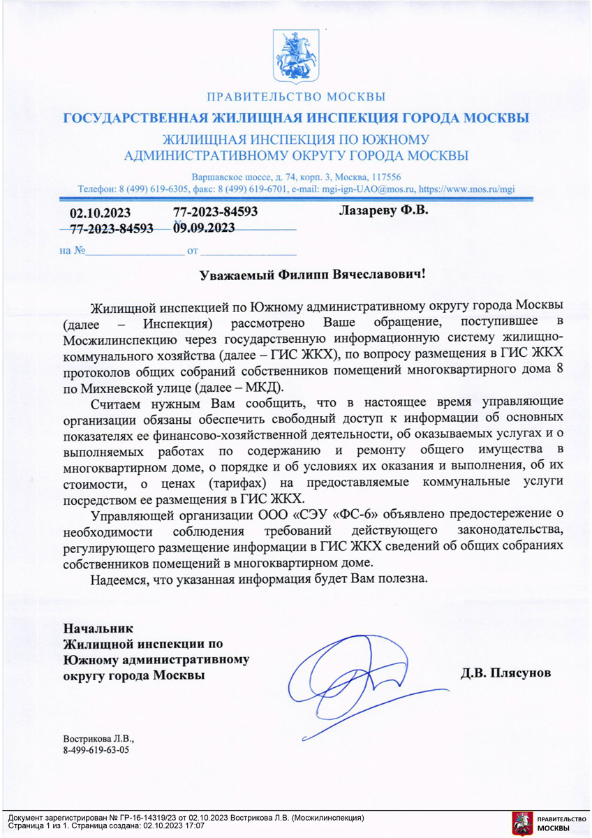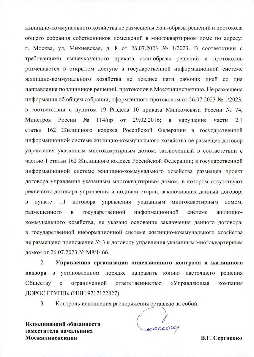 Заявление от 15.08.2023 ДОРОС ГРУПП в Мосжилинспекцию
