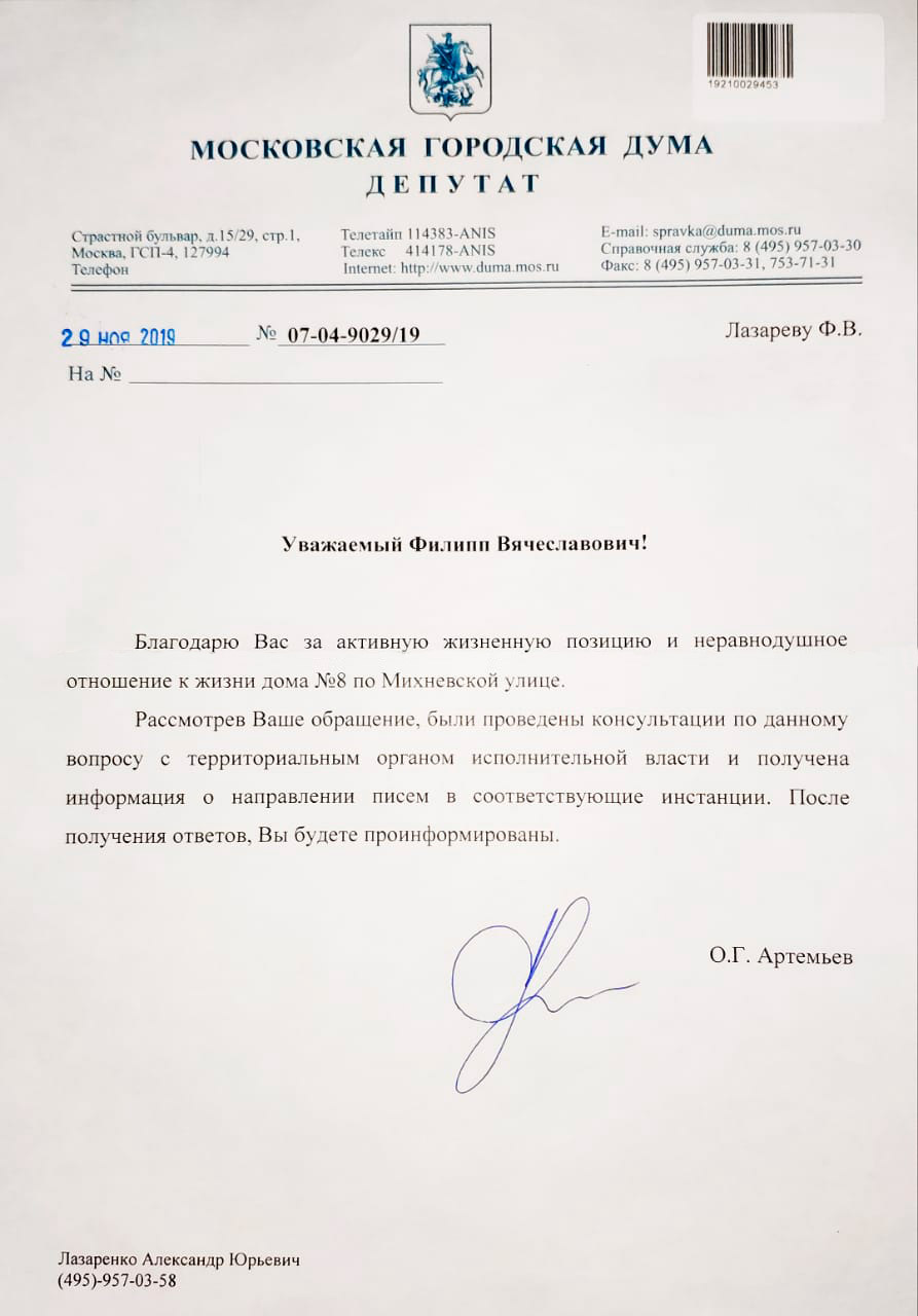 Ответ депутата Московской городской Думы, Артемьева Олега Германовича на обращение с просьбой оказать содействие в решении вопроса с открытием аренды в подземном паркинге нашего дома в связи с критической ситуацией с парковочным пространством и пожарной безопасностью.