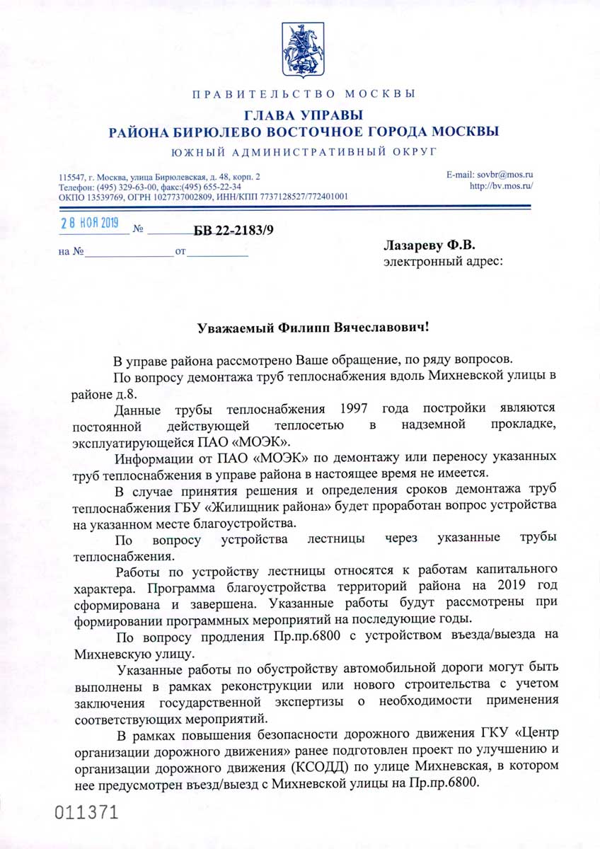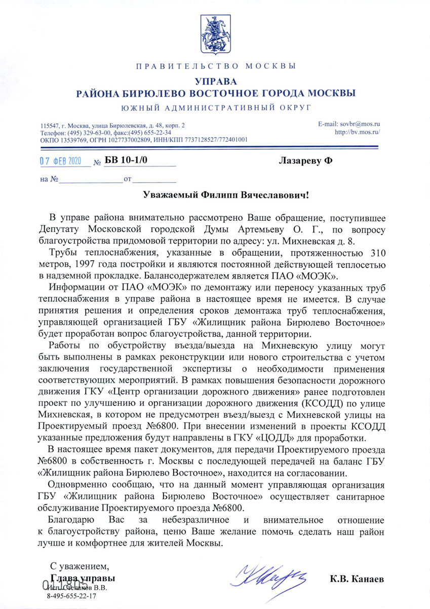 По вопросу завершения Проектируемого проезда №5338 с целью соединения Михневской и Загорьевской улиц в соответствии с Планом границ территорий общего пользования и линейных объектов района Бирюлево Восточное