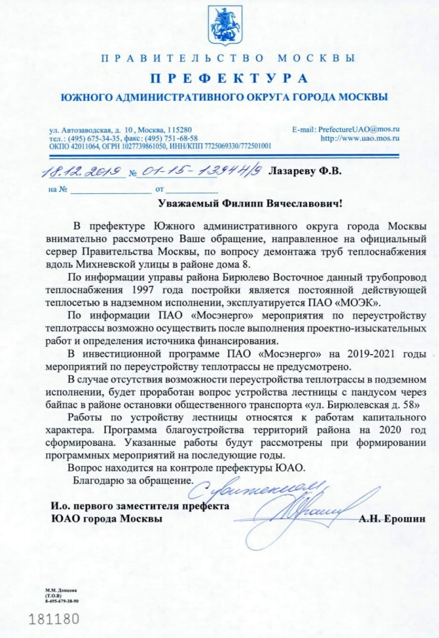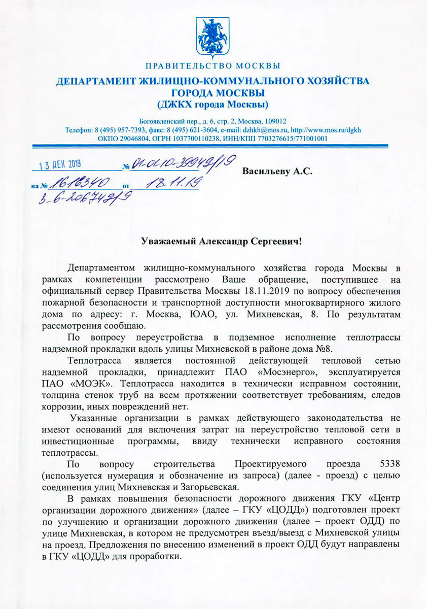 1. По вопросу переустройства и подземного исполнения труб магистральной теплотрассы вдоль дома 8 по Михневской улице.