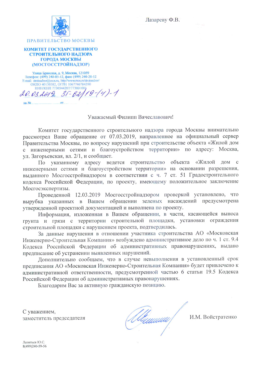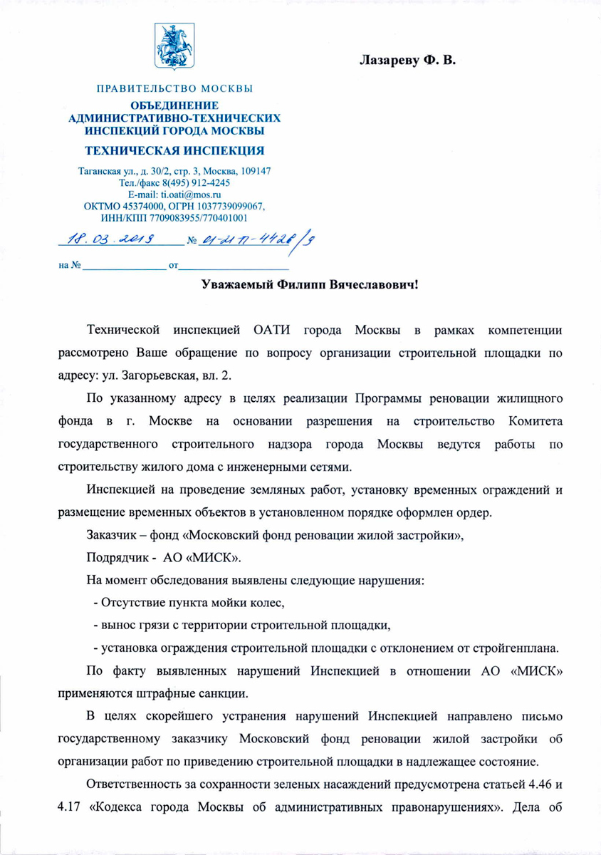 на обращение о нарушениях при строительстве в рамках реализации Программы реновации жилищного фонда в городе Москве по адресу: г. Москва, ЮАО, район Бирюлево Восточное, Загорьевская ул., вл. 2/1