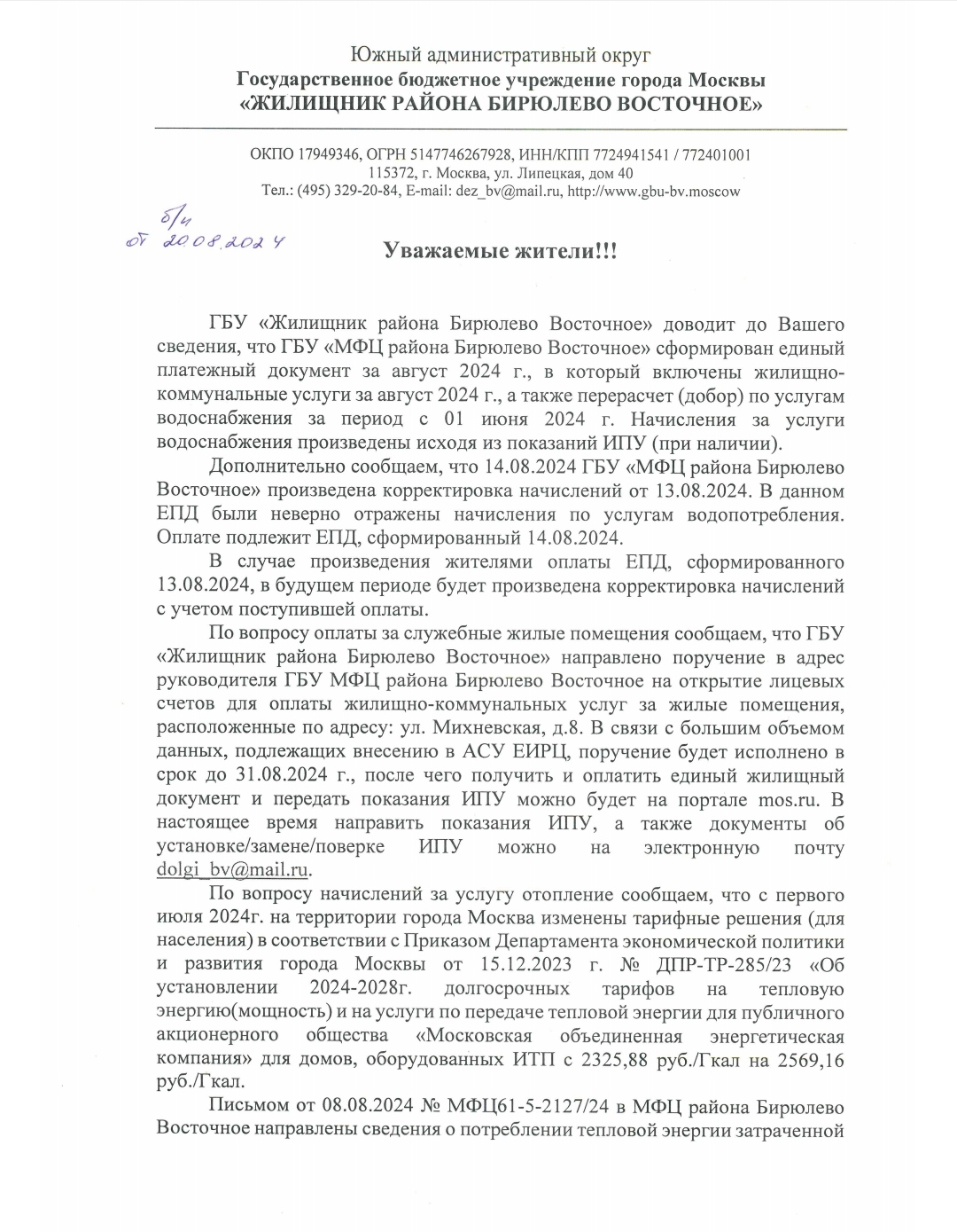 Получено ответ от ГБУ "Жилищник" по начислениям в ЕПД за август 2024 года