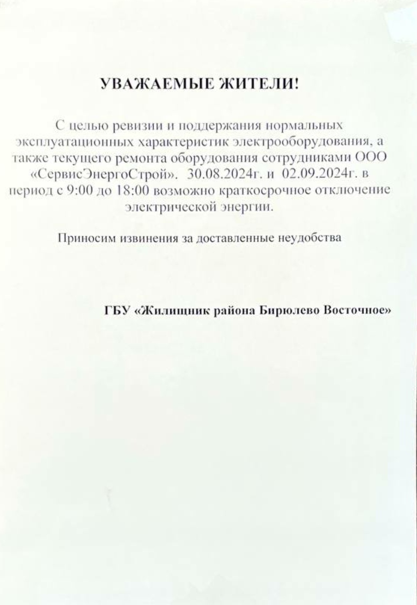 30.08.24 и 02.09.24 возможно краткосрочное отключение электрической энергии