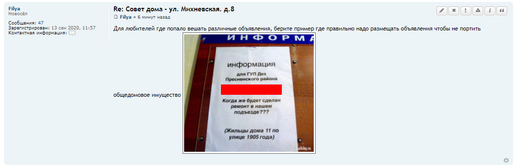 При этом остаюсь при своем мнение, что для размещения различных объявлений предназначены информационные доски, а не лифты, входные двери и стены дома, в результате те, кто клеят эти объявления вне информационных стендов преднамеренно портят общедомовое имущество и это должно пресекаться, в том числе и советом дома!