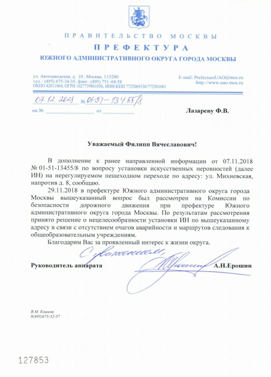 Philipp писал(а):Ранее мной уж отправлялись обращения в гос. структуры с просьбой установить ИДН на нерегулируемом пешеходном переходе на Загорьевской улице рядом с нашим домом, но к сожалению Префектура ЮАО в своих ответах указывает, что нецелесообразно устанавливать ИДН по вышеуказанному адресу в связи с отсутствием очагов аварийности и маршрутов следования к общеобразовательным учреждениям.