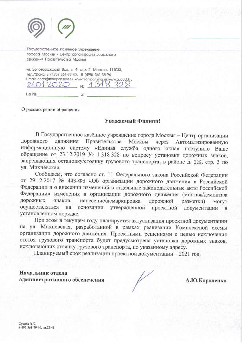 Мной было отправлено обращение в соответствующие структуры с просьбой установить дорожные знаки запрещающие стоянку грузового транспорта на Михневской улице.