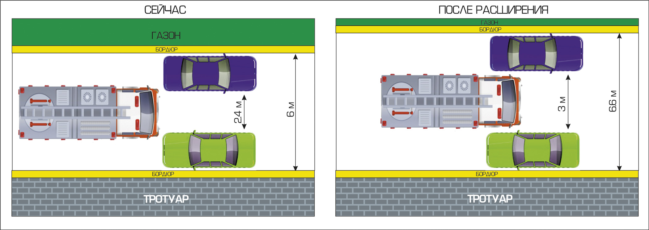 На тротуарах столбики, расширять планируется до фонарных столбов это всего 60 см которых будет достаточно, чтобы проехала пожарная машина! Мы не уменьшаем детские площадки, мы хотим уменьшить немного всего на 60 см газоны чтобы создать возможность проезда спецтехники!!! Количество машин во дворах при этом немного даже уменьшится!