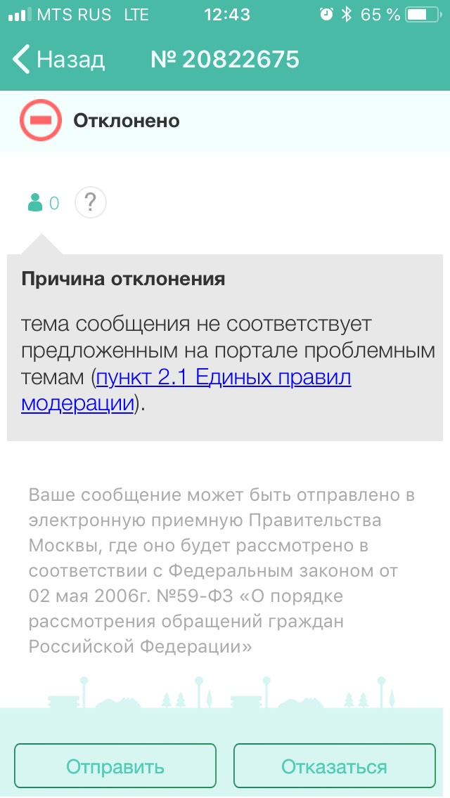 Отклоняют, но предлагают переслать в приёмную правительства Москвы. Пробовал в другую тему тоже самое. Сейчас жду ответа из темы "некачественное содержание стройплощадки", думаю тоже отклонят но благо переправляют в правительство и префектуру.