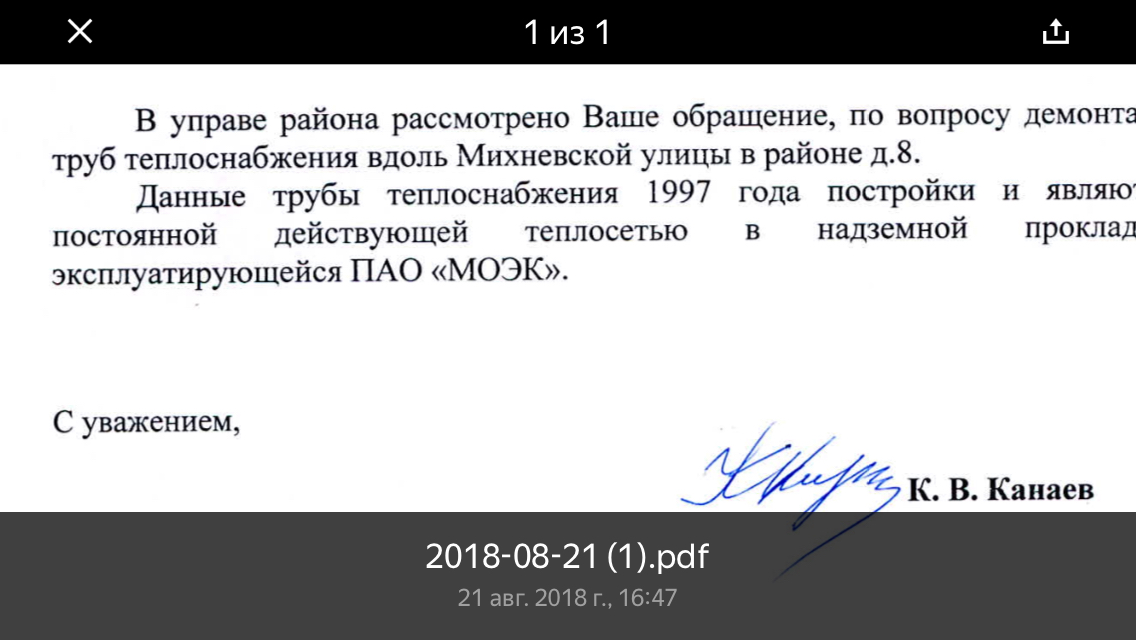 « Ваше обращение, направленное на официальный сервер Правительства Москвы, по вопросу тепловых сетей надземной прокладки, расположенных вблизи дома по адресу: Москва, Михневская ул., д.8, рассмотрено.