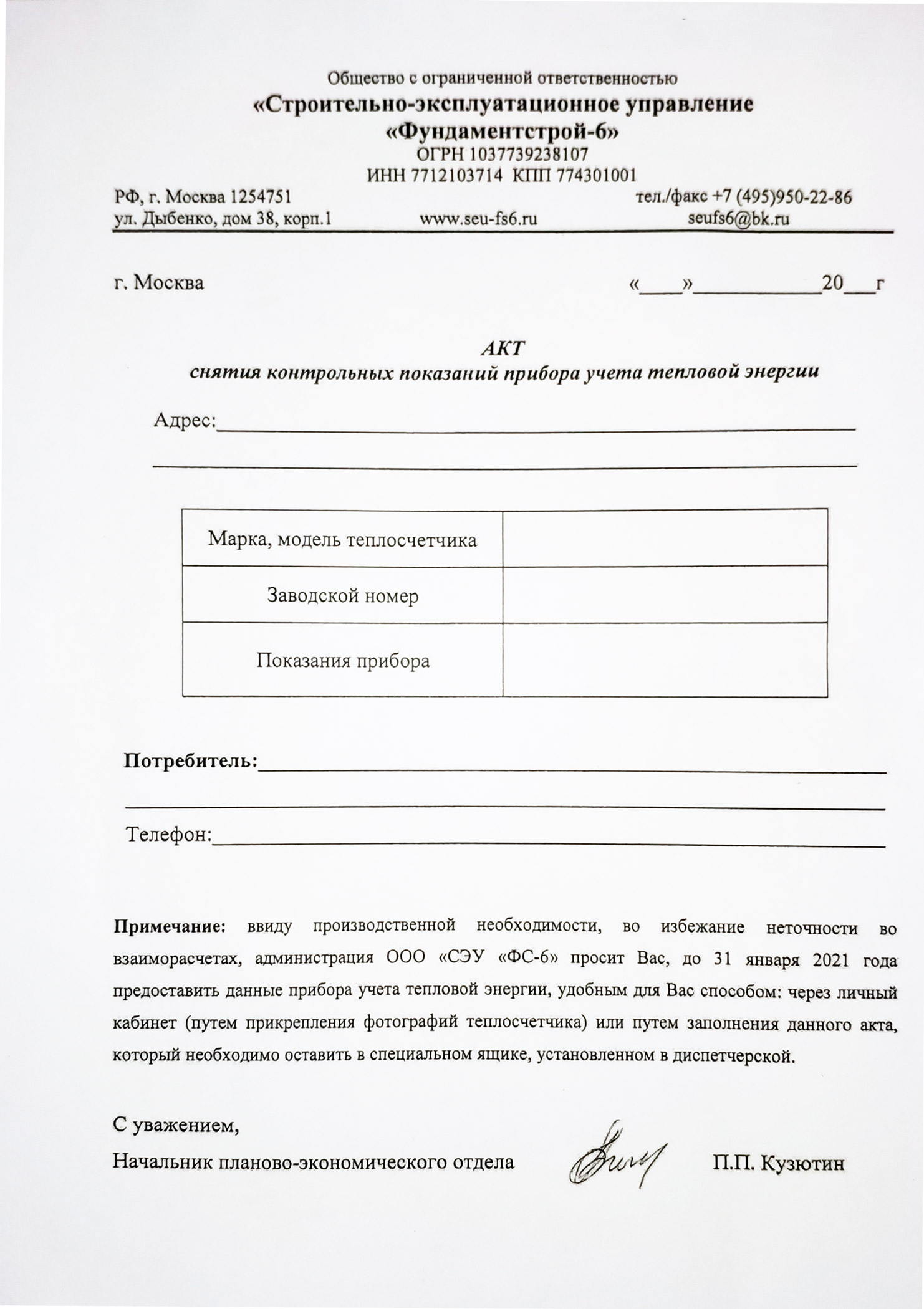 С целью проведения корректного перерасчета за поставленную тепловую энергию по итогам 2020 года, убедительная просьба в срок до 31 января 2021 года, предоставить в УК текущие показания вашего теплосчетчика (ИПУ ТЭ).