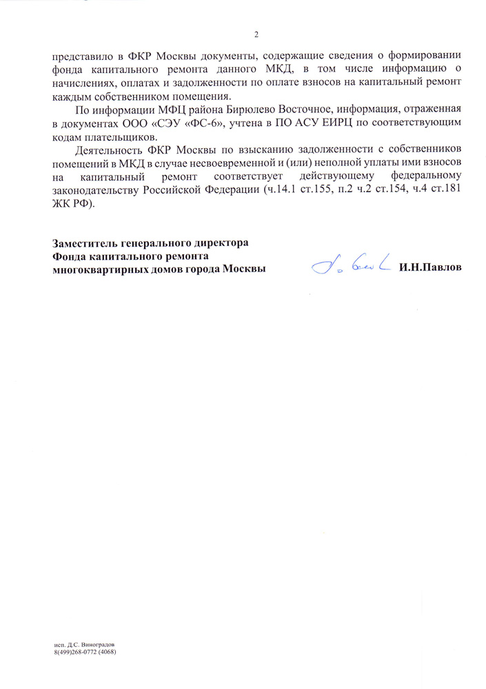 Также в своем обращение я указал, что уже довольно продолжительный период времени в Единых платежных документах присылаемых собственникам помещений дома 8 по Михневской улице города Москвы отсутствует информация о задолженности по капитальному ремонту. В ЕПД указываются только текущие начисления.