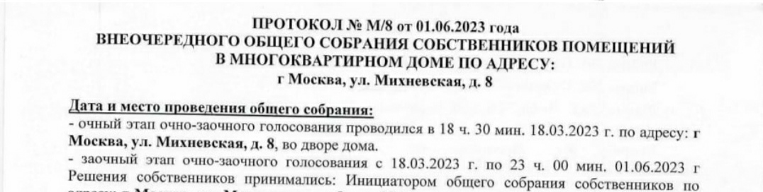 На сегодняшний день Совет дома подготовил официальные обращения в Мосжилинспекцию, Прокуратуру и УФАС г. Москвы с целью инициирования проверки законности проведенного общего собрания, оформленного протоколом М/8 от 01.06.23.