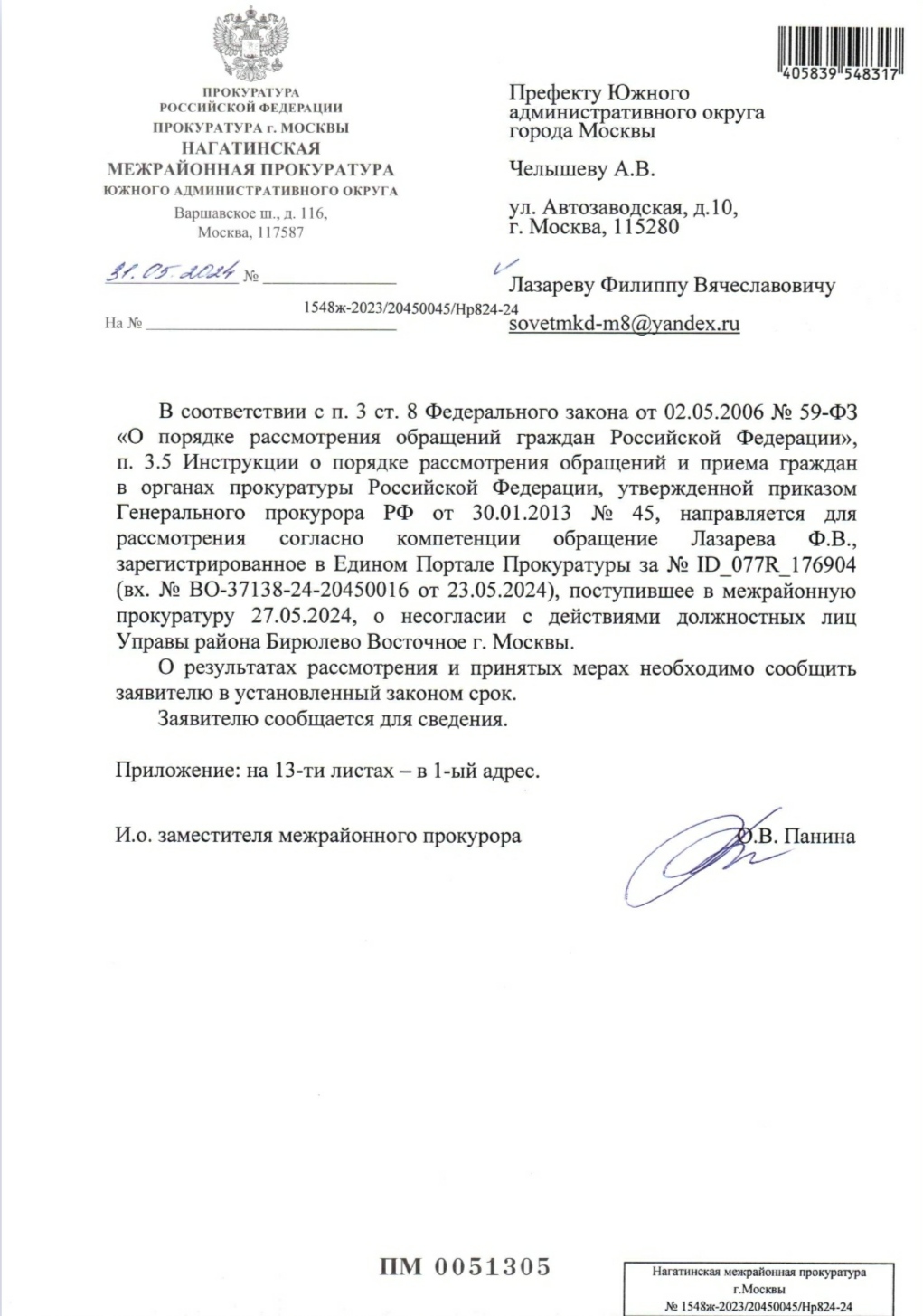 Прокуратура вместо проведения проверки спустила обращение на рассмотрение в Префектуру.