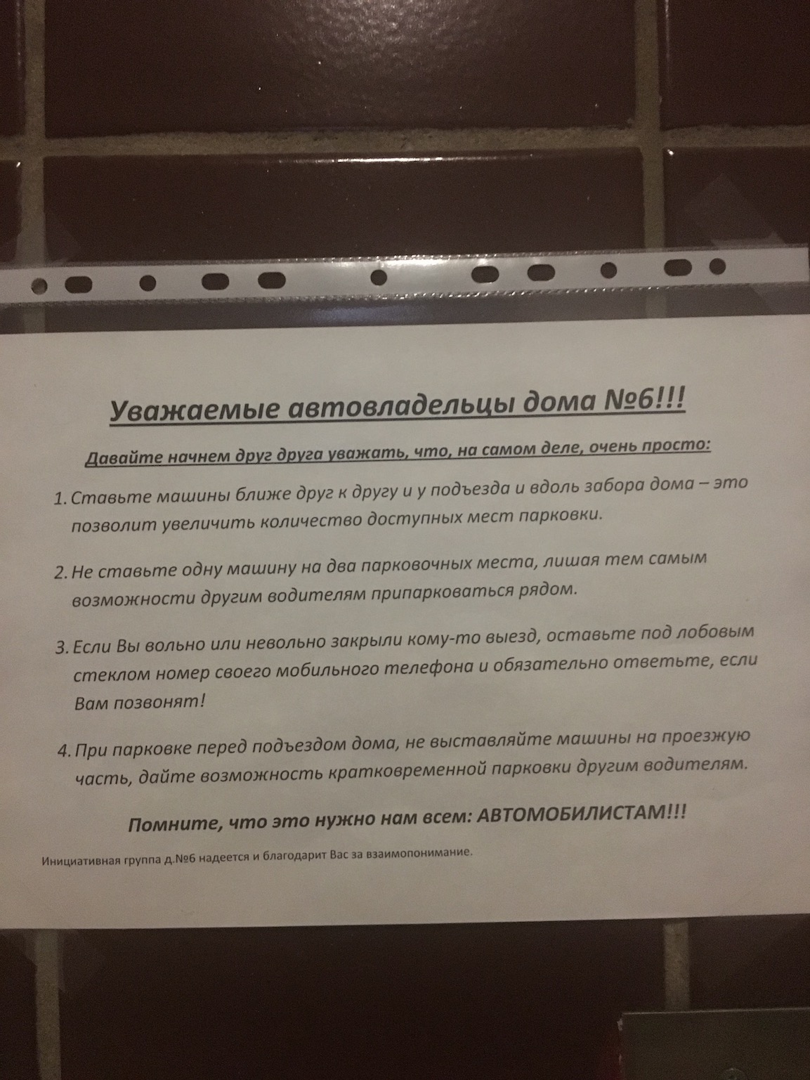 С парковкой жопа ("жопа есть, а слова нет?"). Такая же жопа, как и во всех московских дворах. Ютятся как могут, но не на тротуарах, на которых и столбиков то нет - видимо, обслуживающая компания совсем мух не ловит. Автовладельцы по непонятным причинам не паркуют свои автомобили бампером к подъезду, перед которым свободно приличной площади место. Я так предполагаю, место это для нескольких машин скорой помощи и, как минимум, для двух пожарных машин. И, да, 5 лет назад в доме был пожар, выгорело две квартиры. Спецтранспорт подъехать ближе, чем требовалось, не смог по понятным (?) причинам.