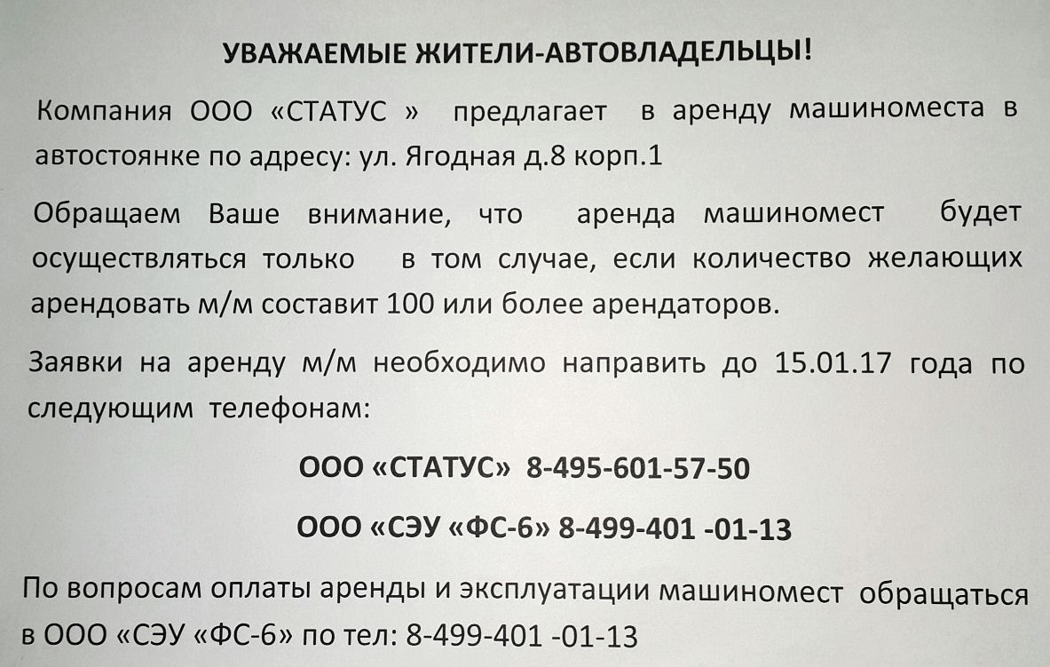 Добрый вечер. Сегодня увидел в подъезде объявление об аренде машино-мест по адресу ул. Ягодная д. 8 к 1. Узнал стоимость 6000 р но на данный момент ищут желающих от 50 человек.