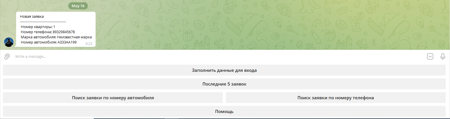 Soagshka2 писал(а):Во время своего ремонта я устал заказывать вечно пропуска на разные автомобили в наш дом и придумал такую идею - создать телеграм-бота, в котором можно отправлять заявку на пропуск автомобиля на территорию ЖК.