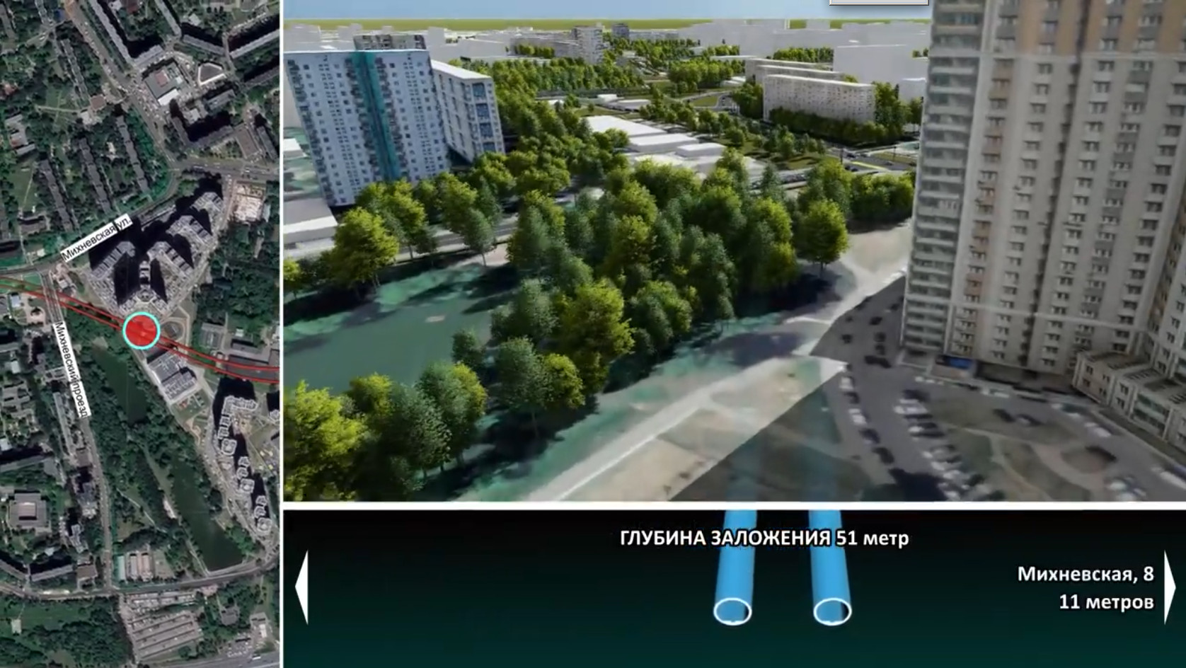 Согласно видео, глубина заложения трассы около Верхнего Бирюлевского пруда составляет от 40 до 51 метра :) .
