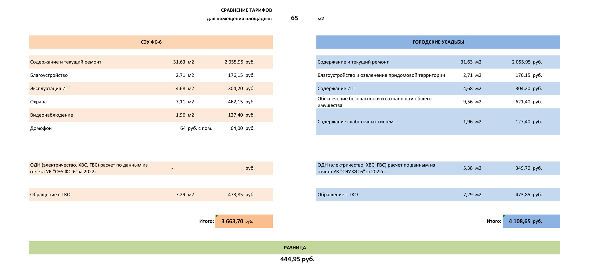 Сравнение тарифов - м2 - СЭУ ФС-6 / ГОРОДСКИЕ УСАДЬБЫ