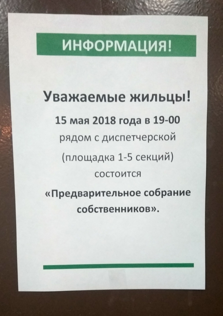 15 мая 2018 года с целью донесения до УК информации о потребностях жителей, представителям УК будет передан распечатанный список вопросов ответы на которые жители хотят получить от УК, а также список пунктов которые мы хотим, чтобы были включены в повестку общего собрания собственников для голосования.