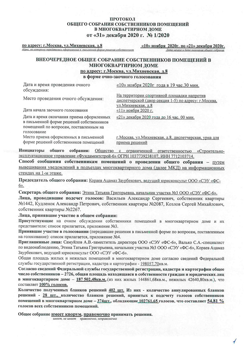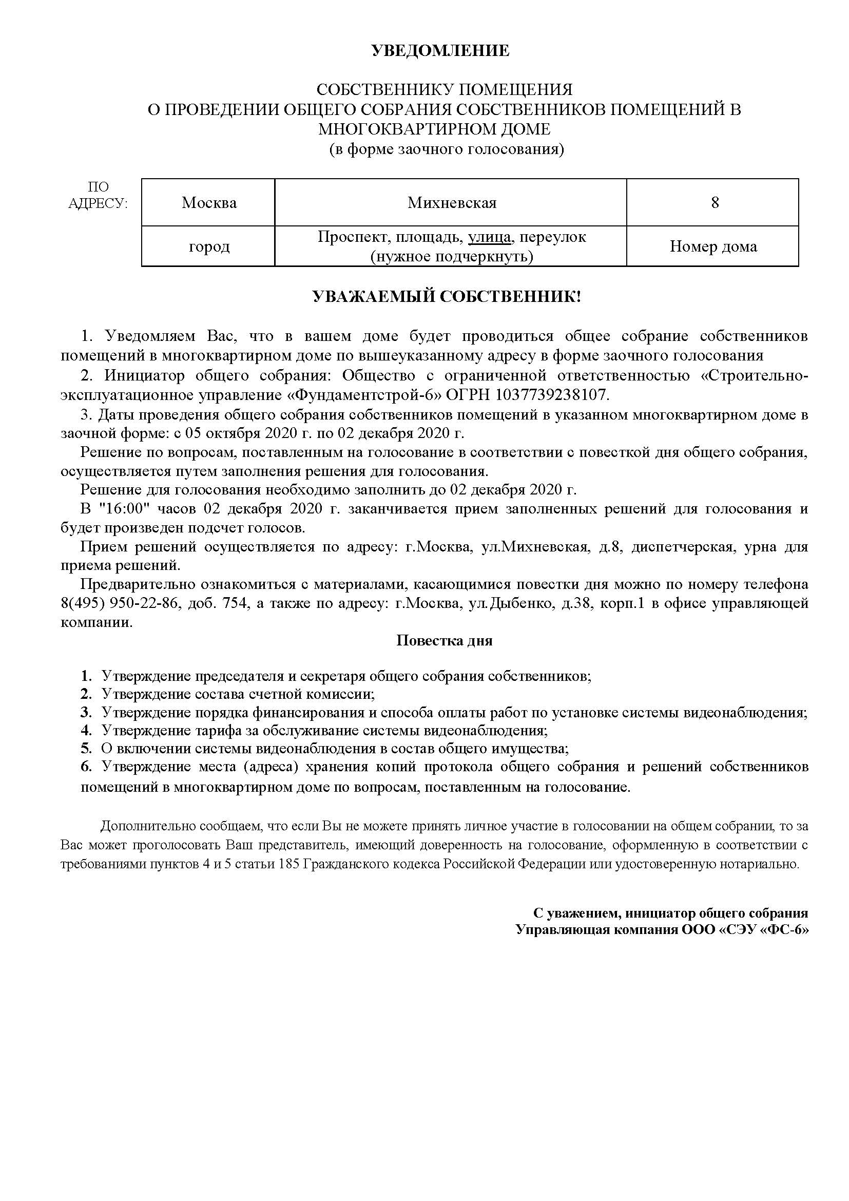 1. Уведомляем Вас, что инициатор общего собрания: Общество с ограниченной ответственностью «Строительное эксплуатационное управление «Фундаментстрой-6» проводит общее собрание собственников помещений в многоквартирном доме по вышеуказанному адресу в форме очно-заочного голосования.