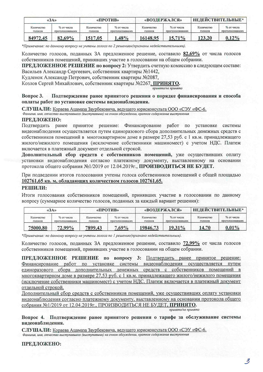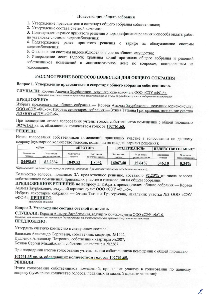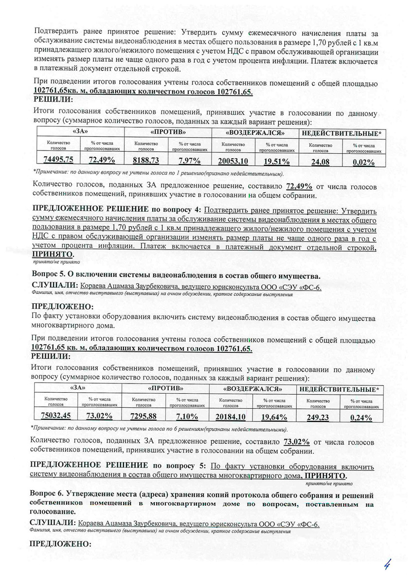 По результатам акта комиссионного заключения, инициатором общего собрания ООО «СЭУ «ФС-6» принято решение организовать проведение нового собрания с включением собственников машиномест в оплату обслуживания системы видеонаблюдения.