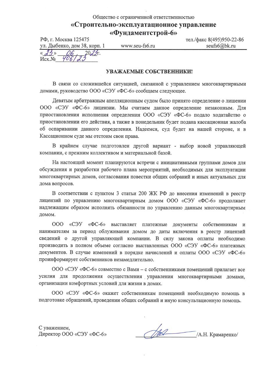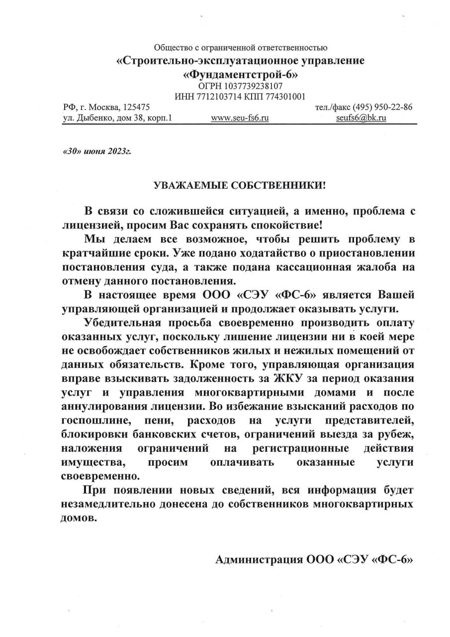 Генеральный директор ООО "СЭУ"ФС-6" сообщил, что подано ходатайство на приостановку постановления суда по отзыву лицензии на время рассмотрения кассационной жалобы (на период рассмотрения кассационной жалобы ООО СЭУ "ФС-6" продолжает обслуживать дома 2-3 месяца). Если ходатайство не будет одобрено то УК СЭУ "ФС-6 организует ОСС с выбором новой УК с текущим штатом и материальной базой (простым языком - смена Юр.лица).