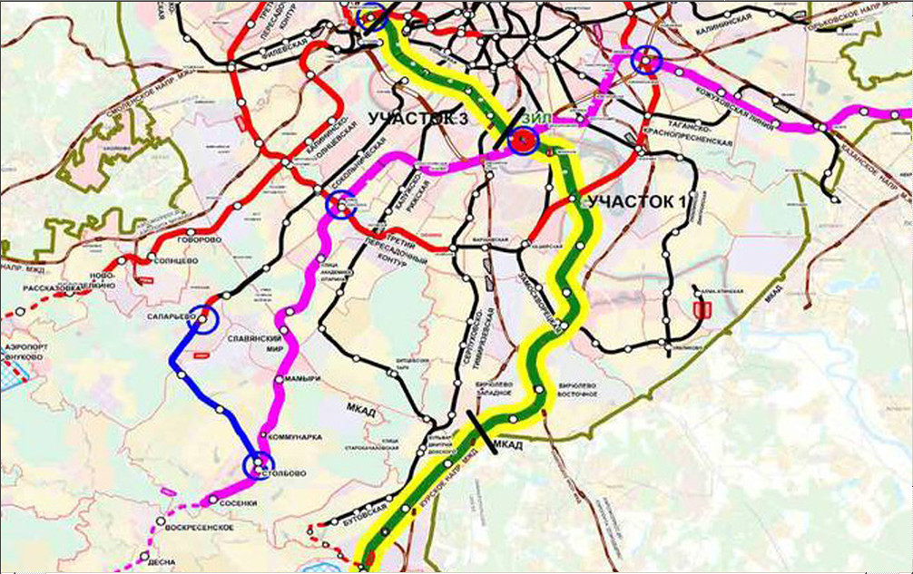 Примечание: На схеме Бирюлевская хорда представлена толстой зеленой линией, при этом основная ее часть выделена желтым цветом (желтым цветом обведены три участка этой хорды: первый участок начинается в районе ЗИЛ, опускается до Бирюлево и заканчивается в районе МКАД, второй участок начинается в районе МКАД и продлевается в районы Новой Москвы - через восточные окраины Северного и Южного Бутово, третий участок начинается в районе ЗИЛ и продлевается в центральные районы Москвы - до Делового Центра (в район Москва-Сити). Оставшаяся часть Бирюлевской хорды продлевается до западных окраин Москвы - от Делового Центра до заМКАДовского Рублево. Исходя из логики данной нумерации можно сделать вывод, что строительство данной хорды предполагается в несколько этапов, с учетом данной нумерации, при этом первый участок хорды - от ЗИЛ до Бирюлево (до МКАД) будет построен в первую очередь, следующий участок хорды будет построен до Новой Москвы и уже после этого хорда будет продлена в центральные районы Москвы - до Москва-Сити. И уже в последнюю очередь хорда будет продлена от Делового Центра до Рублево. При этом, на первом участке Бирюлевской хорды (включающем районы Бирюлево) предусмотрено строительство 9 станций метро, на втором и третьем участве хорды - по 8 станций метро, и на участке от Делового Центра до Рублево - еще 8 станций метро, а всего данная хорда будет иметь 33 станции.