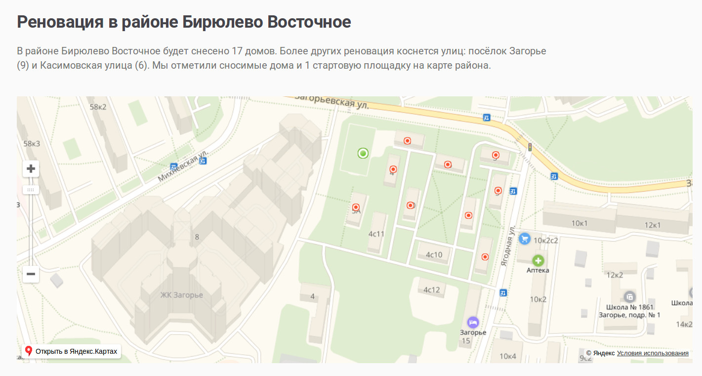 На Яндекс.карте дома в Загорье для реновации можно посмотреть по адресу: http://renobzor.ru/karta/biryulevo-vostochnoe/ .