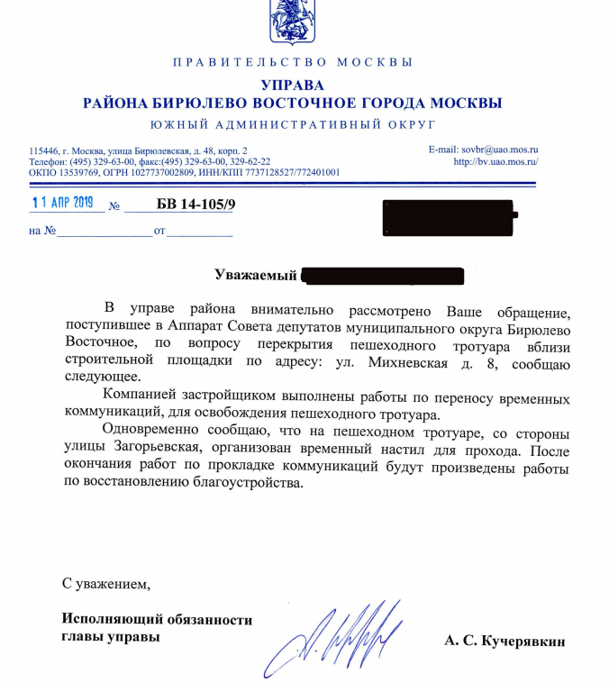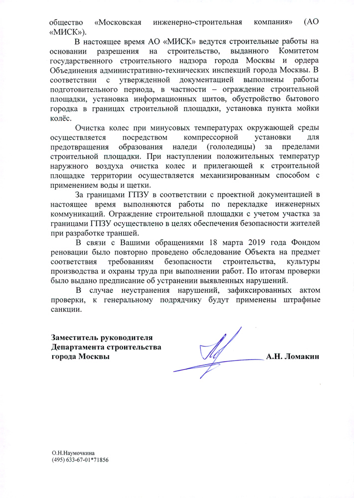 AnSab писал(а):Вот как мне ответили из префектуры ЮАО в крайний раз после очередного письма через их интернет-приёмную по поводу бардака вокруг стройки. Думаю, если ген подрядчика, действительно, мурыжат проверками и штрафуют после таких сообщений, то каждому неравнодушному нужно писать подобные жалобы, чтобы держать этих поросят в напряге и принуждать к порядку.