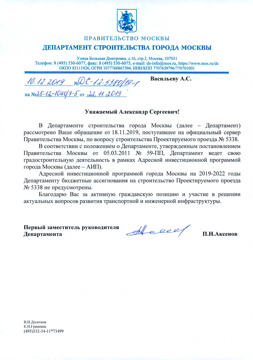 В Адресной Инвестиционной Программе (АИП) города Москвы на период 2019-2022 год бюджетных ассигнований на строительство Проектируемого проезда №5338 не предусмотрено.