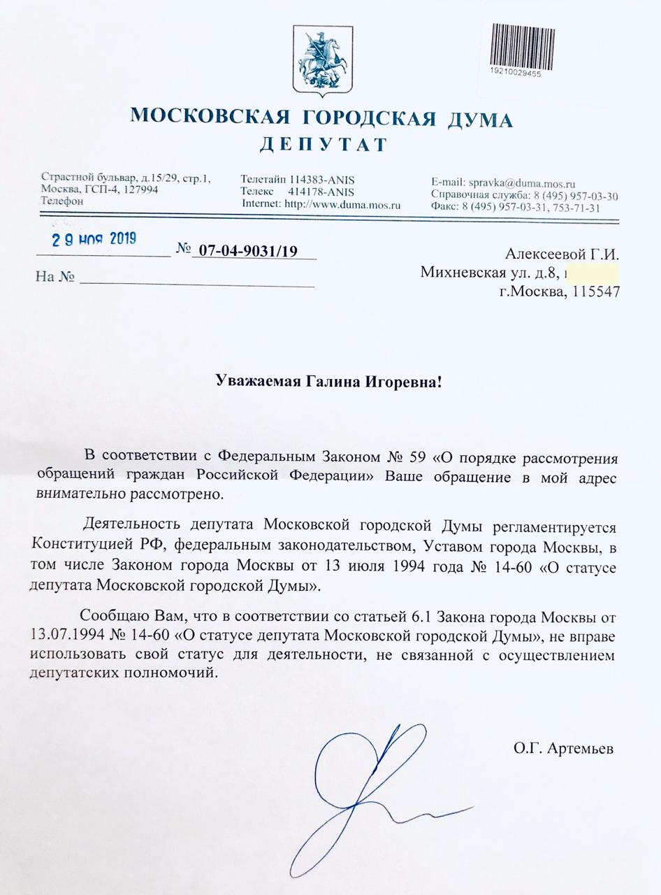 Ответ депутата Московской городской Думы, Артемьева Олега Германовича на обращение с просьбой оказать содействие в решении вопроса с открытием аренды в подземном паркинге нашего дома в связи с критической ситуацией с парковочным пространством и пожарной безопасностью.