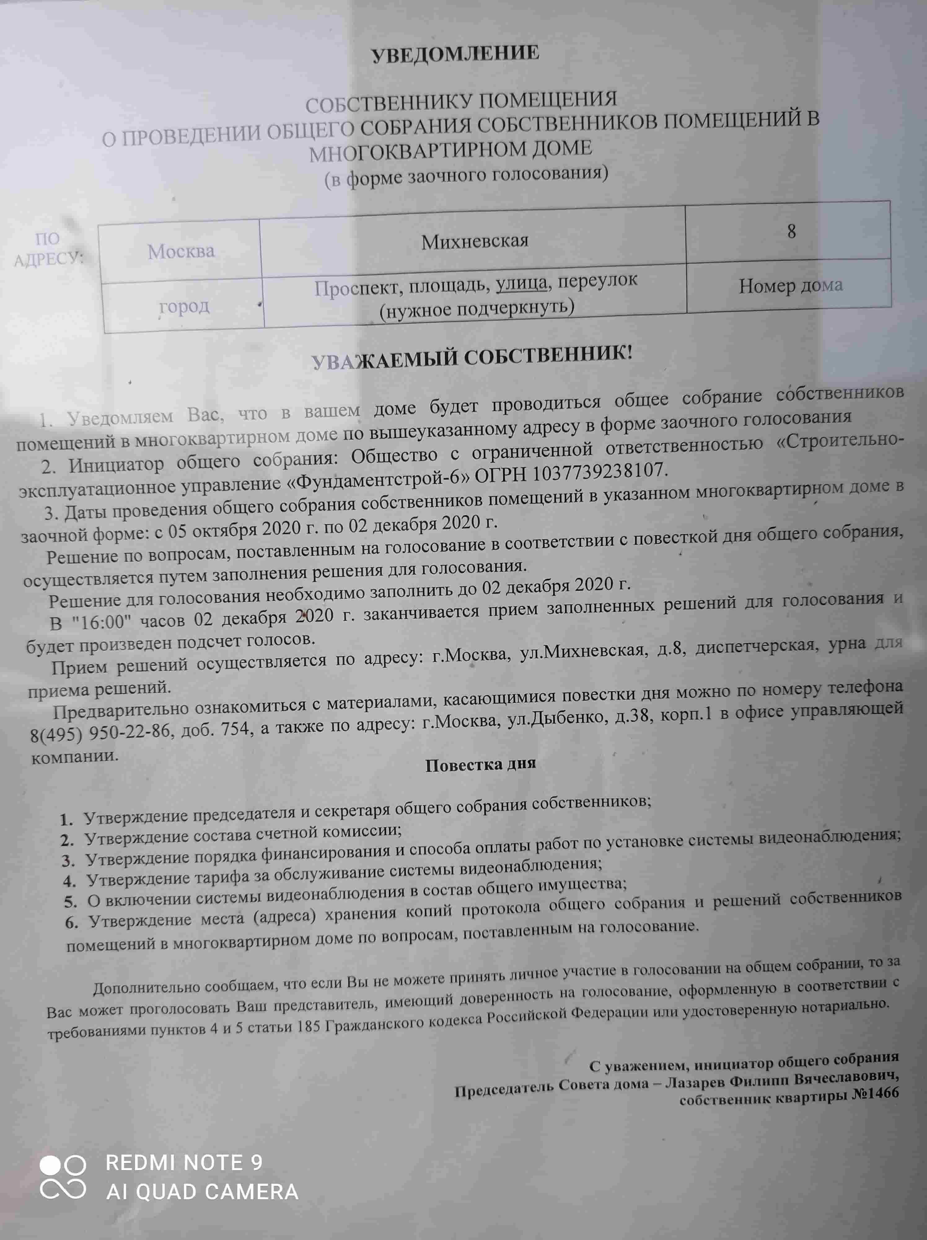 p.s. Дополнительный сбор средств с собственников помещений, уже осуществивших оплату установки видеонаблюдения согласно платежному документу, выставленному на основании протокола общего собрания №1/2019 от 12.04.2019г., ПРОИЗВОДИТЬСЯ НЕ БУДЕТ.