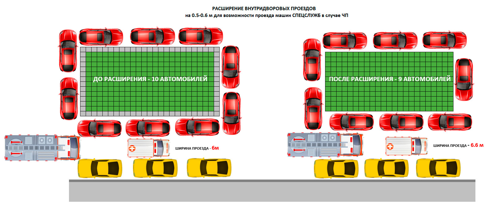 Сейчас мы можем составить и направить обращение в УК с просьбой рассмотреть возможность расширения внутридворовых проездов за счет уменьшения газонов на 60 см.