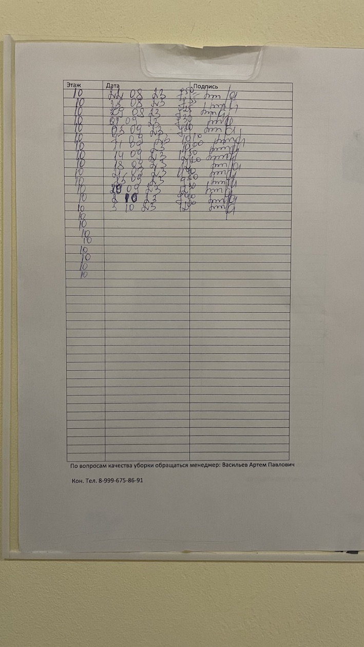 На каждом этаже графики уборки с указанием времени проведения работ и подписью исполнителя