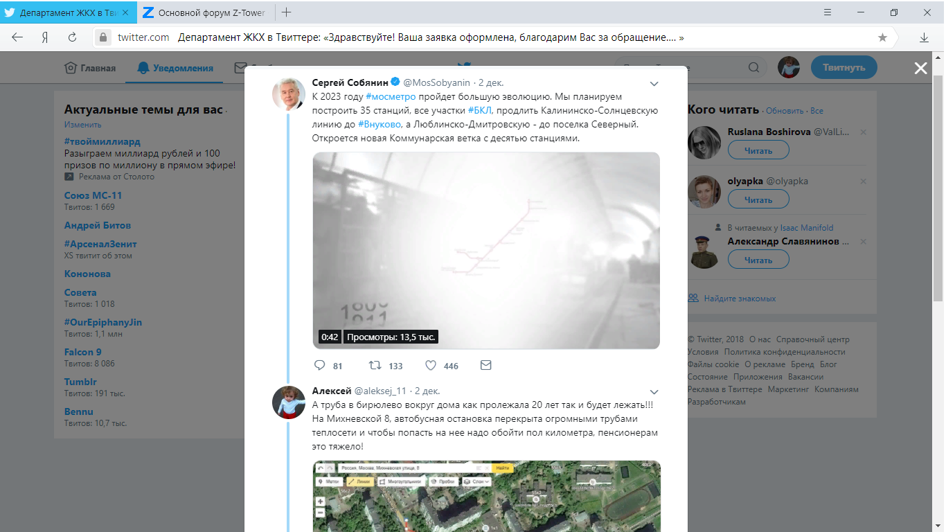 AlekseyE писал(а):Начал я тут обращаться к Сергею Семеновичу через твитер. На каждый его пост о благоустройстве города отвечал про нашу трубу и кажется заметили, мало надежд конечно, но все же.